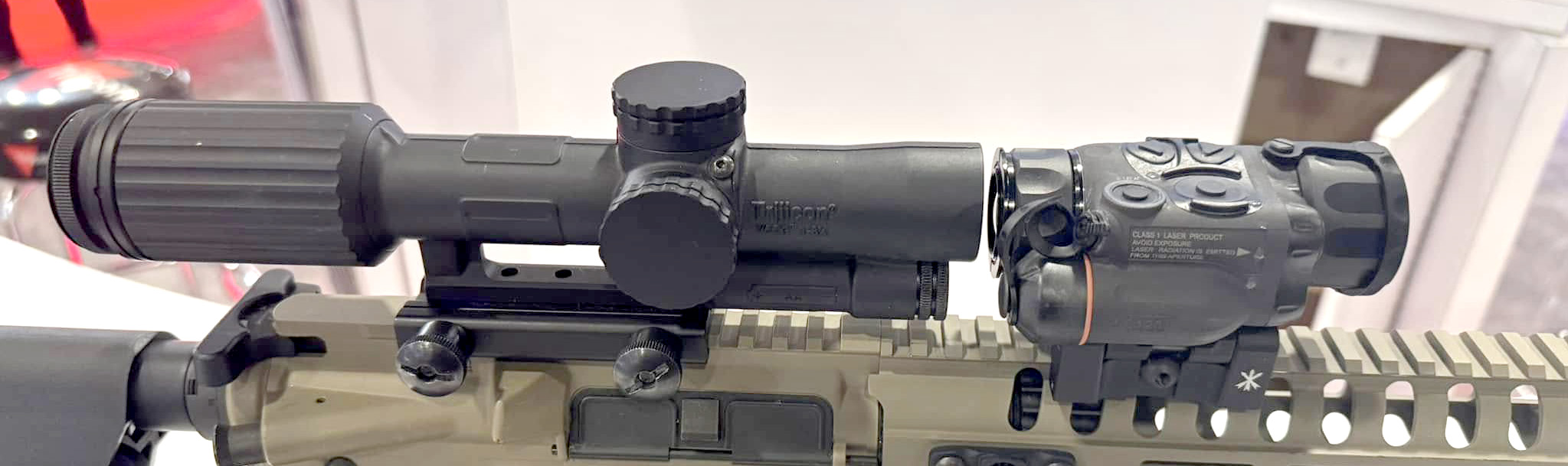 3. TRIJICON: These guys are amazing and it isn’t just because they put Bible verses on their products, although I do LOVE THAT!!! I still believe they make the overall best imaging products. Yes, I am a Nightforce fan (I will get to that) but If I could only choose one optic company this would be it. The RMR is tried and true, the ACOG/VCOG is tank like, and their OASYS thermal is still the best clip on out there and likely the overall singular best NV/Thermal option made. Yes, they are expensive, but again if you’re into the best or a true deployment “life depends on it” unit, these are likely what you’re going to choose. I own the exact setup below. The last three years I have walked around the show with the intent to seek out the best thermal option and for the third year in a row, this is the “BEST YOU CAN BUY” setup. I should also mention that they had perhaps the most convincing display I have ever seen showing the amount of real war abuse their products had taken, literally bullet holes in an ACOG and it was still functioning (not to mention it saved someone’s life from a headshot). That is impressive and defining. Most people don’t see the build benefits of the newer VCOG vs a traditional LPVO. If you aren’t “aware”, you might want to start noticing. This is the future.